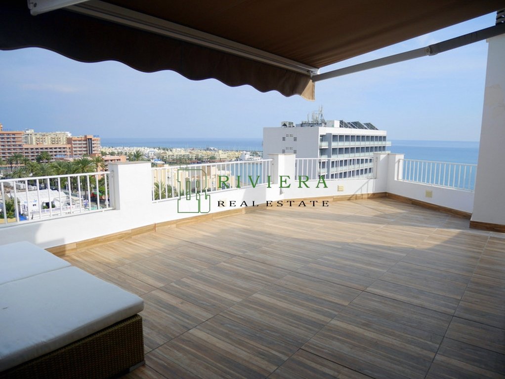 La terraza dispone de ducha exterior y sauna. Vistas muy buenas al mar, Puerto Marina y la montaña. Orientada al este y suroeste.