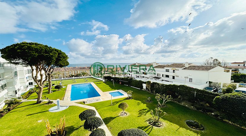 Desde su soleada terraza se puede disfrutar de maravillosas vistas al mar, jardín y piscina, parking comunitario en el edificio y cerca de todo tipo de servicios!