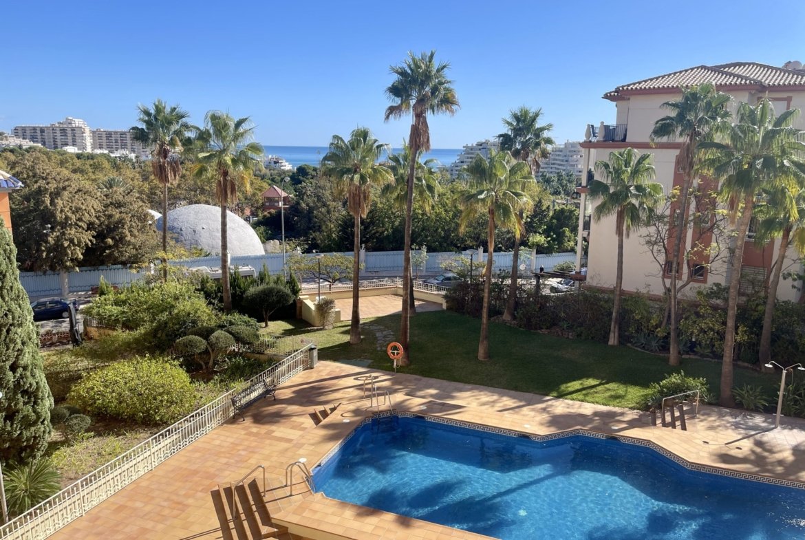 Se encuentra en un edificio bien mantenido y cuenta con servicios cercanos. El inmueble consta de un hall de entrada, un amplio salón-comedor y una terraza de aproximadamente 9 m2 con vistas al mar, jardín y piscina. La cocina incluye un lavadero y hay 2 dormitorios dobles con armarios empotrados, siendo el dormitorio principal con baño en suite. Además, cuenta con 1 baño con bañera para visitas.
